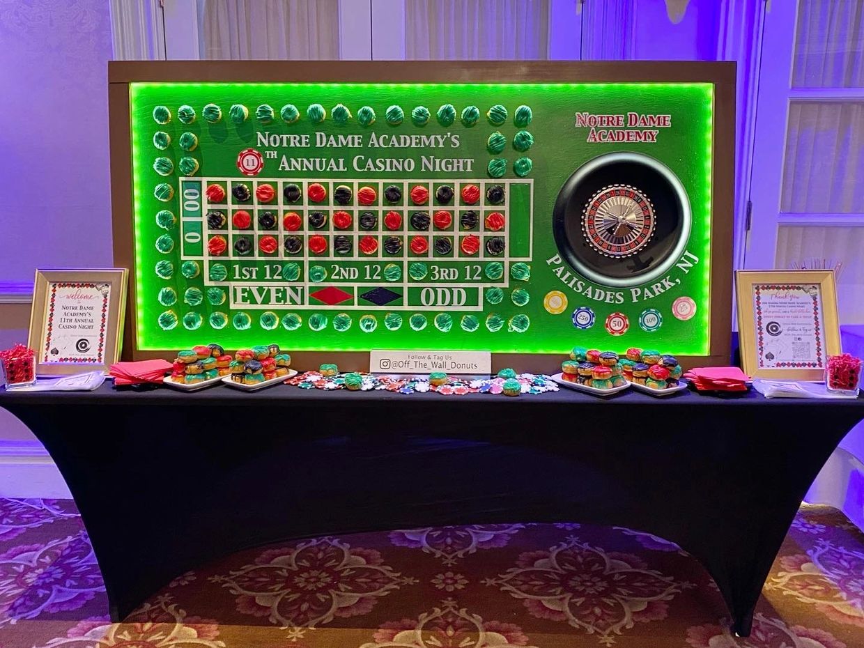 Off The Wall Donuts donated our Roulette Table Donut Wall to a Casino Night Fundraiser benefitting Notre Dame Academy in Palisades Park, NJ. The event was held at the Fiesta in Wood Ridge. We are happy to support the children of Notre Dame Academy. As parents of children who also attend Catholic School, we know how important these fundraising events are to the school, faculty, and most of all, THE STUDENTS!