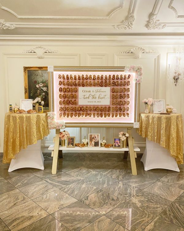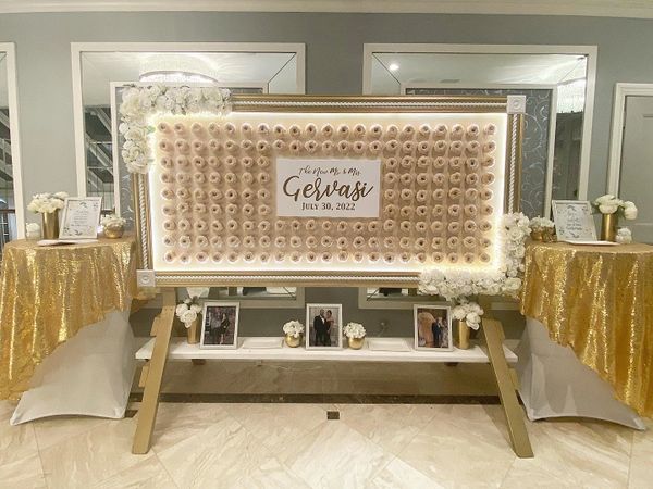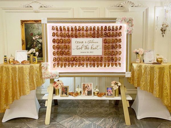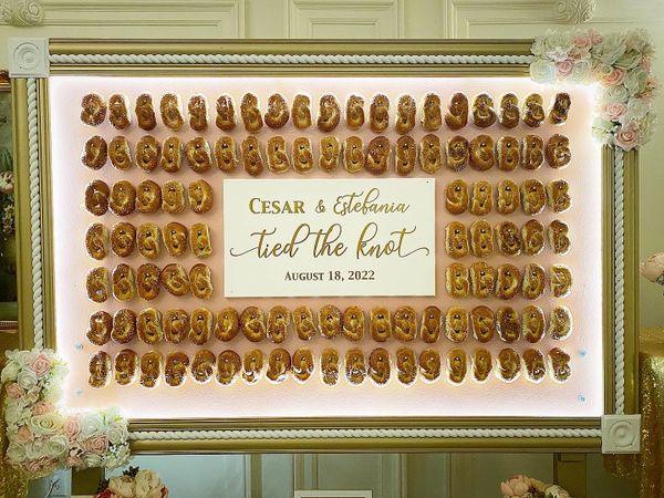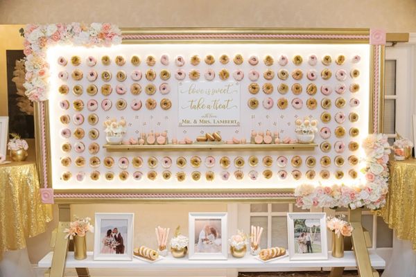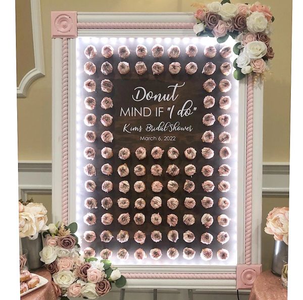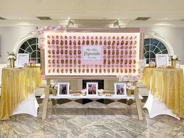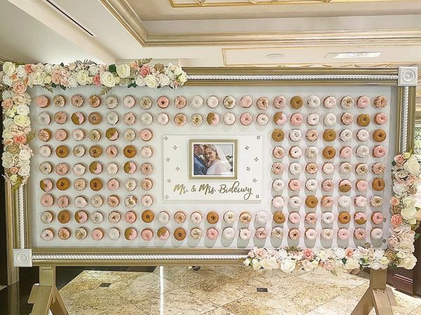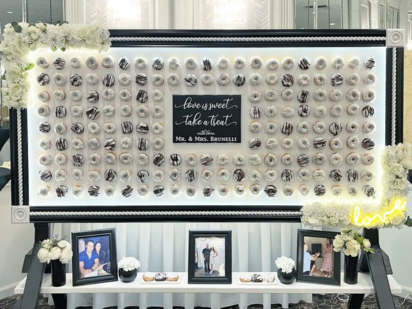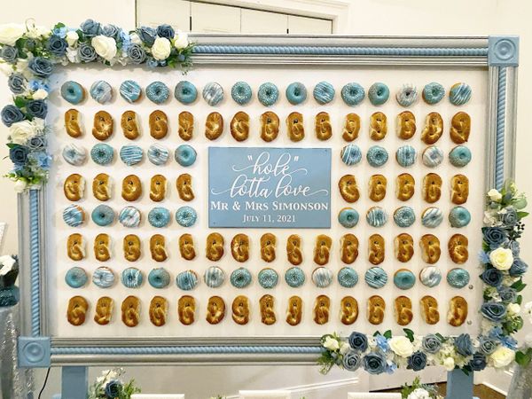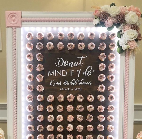 Our 3x4 Wall holds 3x4 feet of Donuts and/or Pretzels, LED Lighting, & a Custom Center Design. This Wall is fully customizable & can feature floral accent corners. The 3x4 Wall Package includes 8 dozen Mini Sized Donuts, or 4 dozen Full Sized Donuts, or 60 Pretzels +2 Mustards, or 5 dozen Mini Sized Donuts & 40 Pretzels + 2 Mustards, signature delivery and set up with beautiful decorated side tables, and personalized favor bags.