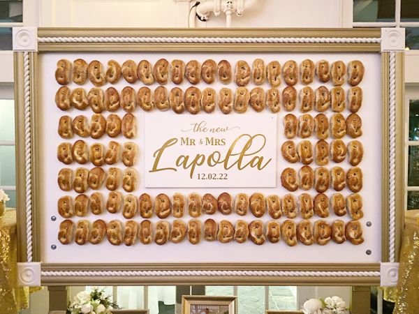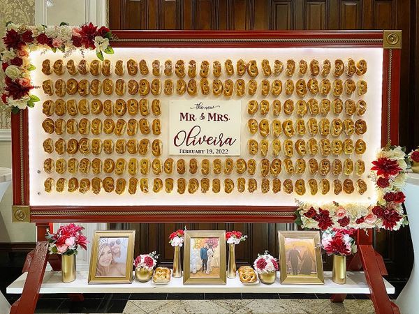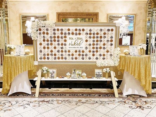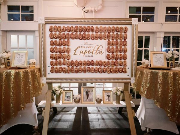 Our Classic Wall, boasting 4x8 feet of Donuts and/or Pretzels, LED Lighting, & a Custom Center Design. Our Madison Wall is fully customizable & can feature floral accent corners. The Madison Wall Package includes 14 dozen Full Sized Donuts, or 180 Pretzels +4 Mustards, or 8 dozen Full Sized Donuts & 90 Pretzels + 2 Mustards, signature delivery and set up with beautiful decorated side tables, underlying bench, and personalized favor bags.